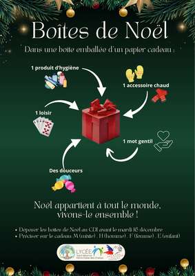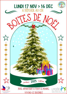 Boites de Noël en partenariat avec le Secours Populaire romanais 11/12/2025 27 boîtes obtenues ! Un grand MERCI au nom de tous les bénéficiaires du Secours Populaire ! Grâce à l'engagement de 3 de nos éco-délégués, le dispositif "Boîtes de Noël" est renouvelé cette année encore. Les élèves, familles et personnels sont invités à offrir une boîte emballée d'un papier cadeau, à l'intérieur de laquelle il y aura : un mot réconfortant, quelque chose de bon, de chaud, un produit d'hygiène, un loisir (livre, jeu, ...) Ces boîtes sont à déposer au CDI avant le 16 décembre et le Secours Populaire les distribuera ensuite à ces bénéficiaires. Nous vous remercions d'avance pour votre participation.
