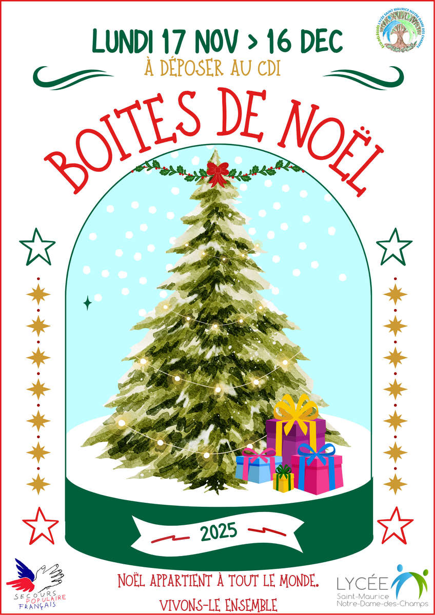 Boites de Noël en partenariat avec le Secours Populaire romanais 26/11/2025 Grâce à l'engagement de 3 de nos éco-délégués, le dispositif "Boîtes de Noël" est renouvelé cette année encore. Les élèves, familles et personnels sont invités à offrir une boîte emballée d'un papier cadeau, à l'intérieur de laquelle il y aura : un mot réconfortant, quelque chose de bon, de chaud, un produit d'hygiène, un loisir (livre, jeu, ...) Ces boîtes sont à déposer au CDI avant le 16 décembre et le Secours Populaire les distribuera ensuite à ces bénéficiaires. Nous vous remercions d'avance pour votre participation.
